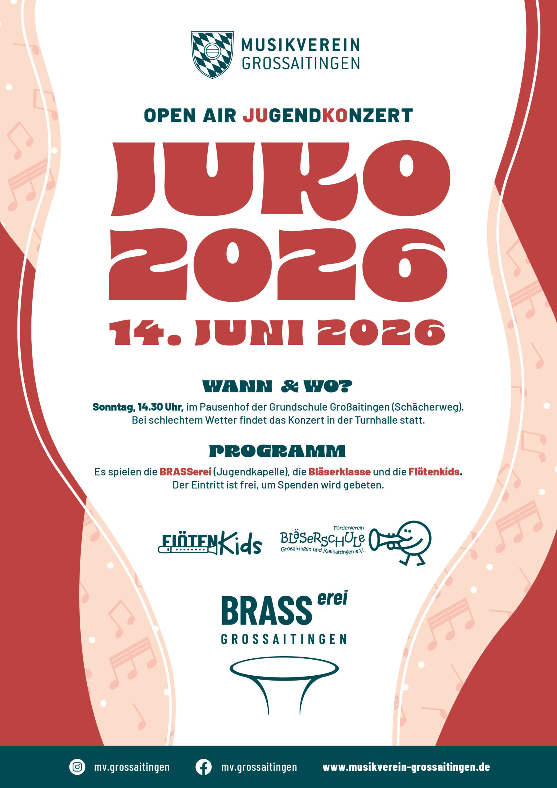 Am Sonntag, 14. Juni 2026, um 14.30 Uhr findet wieder unser jährliches OpenAir Jugendkonzert im Pausenhof der Grundschule Großaitingen (Schächerweg statt).